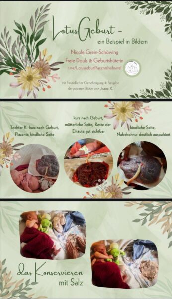 eine weitere Stimme einer jungen Mutter aus meinen Gesprächskreisen „Meine Art“ sowie „Lotusgeburt & Plazentaheilmittel“: „Du hast uns während der Ss sowie Wochenbett begleitet, jetzt